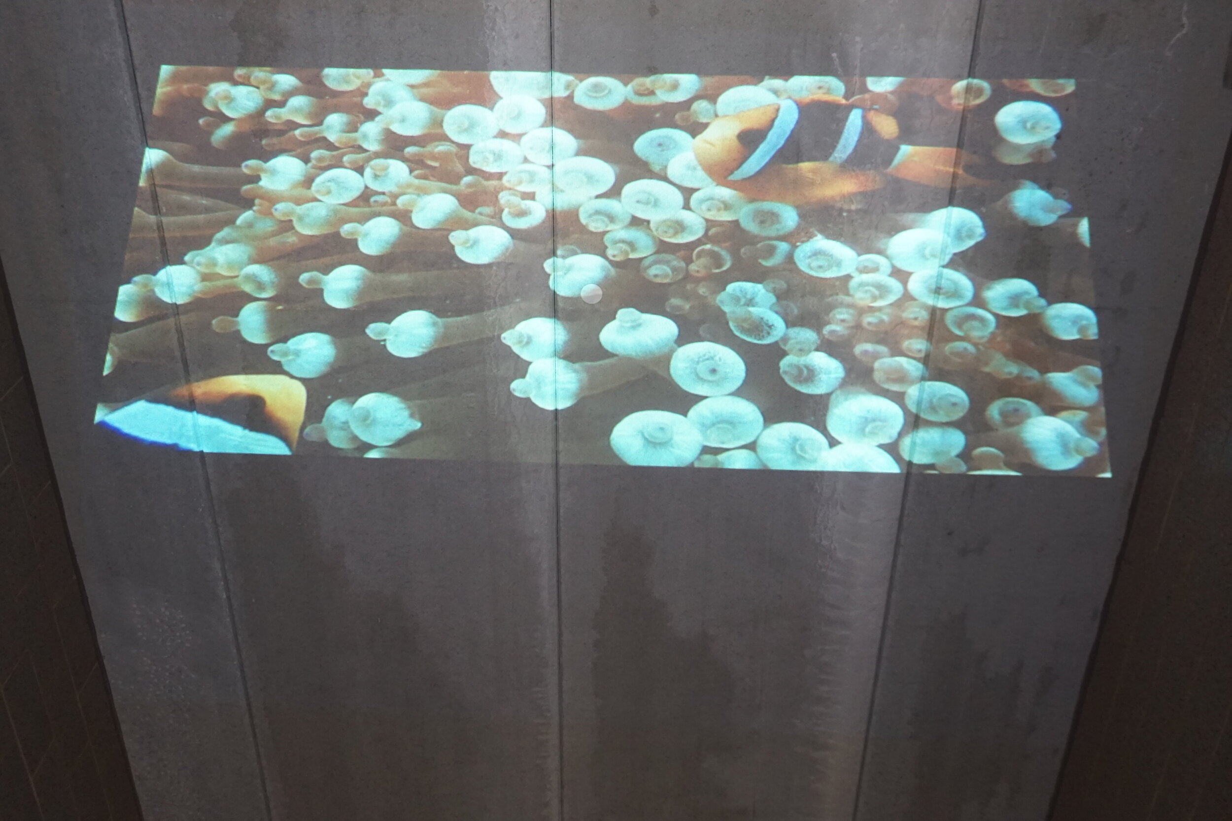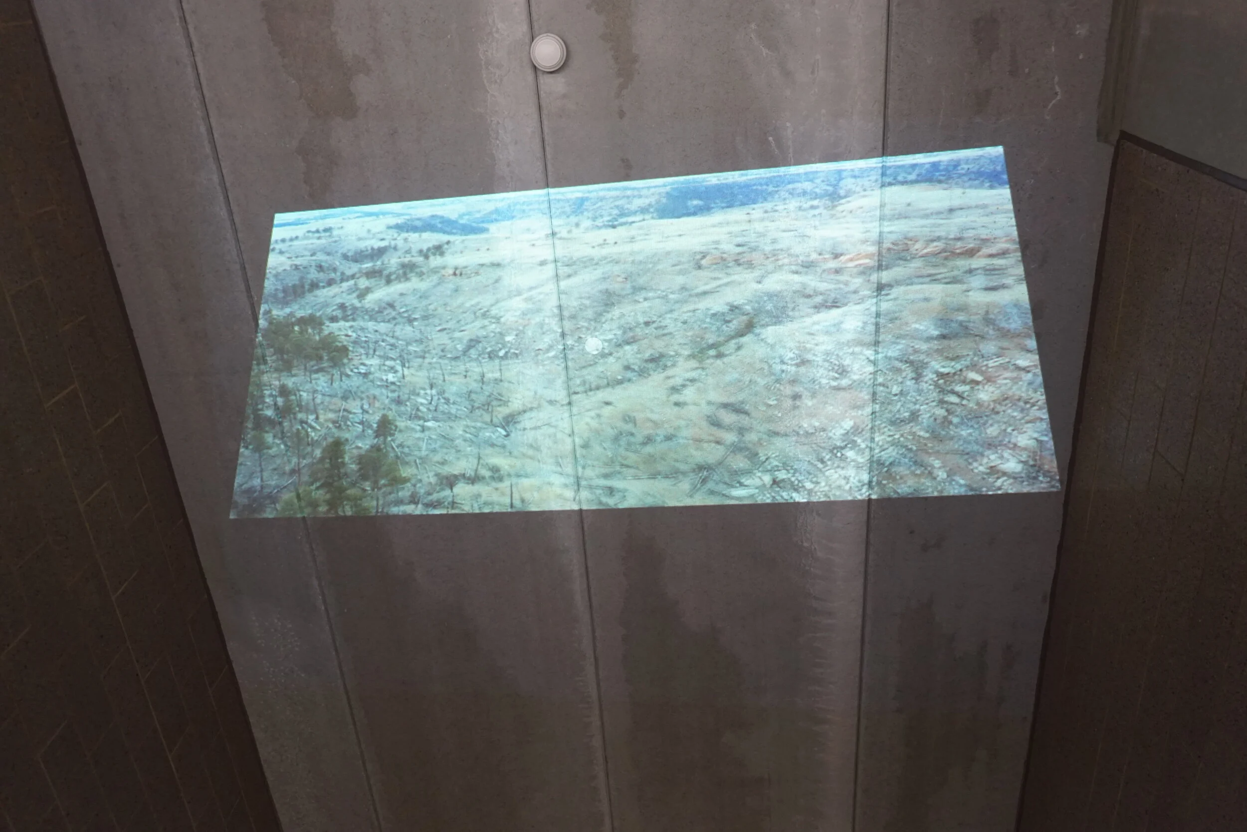 Taking a moment to lay down and watch this video loop over and over gave myself a moment to reflect on my own relationships to land and space itself. Without the video being projected onto the ceiling, I would have never changed my actions to accommodate the comfort of my experience. I think the fact that this video was project on the ceiling was the most powerful element of the installation.“